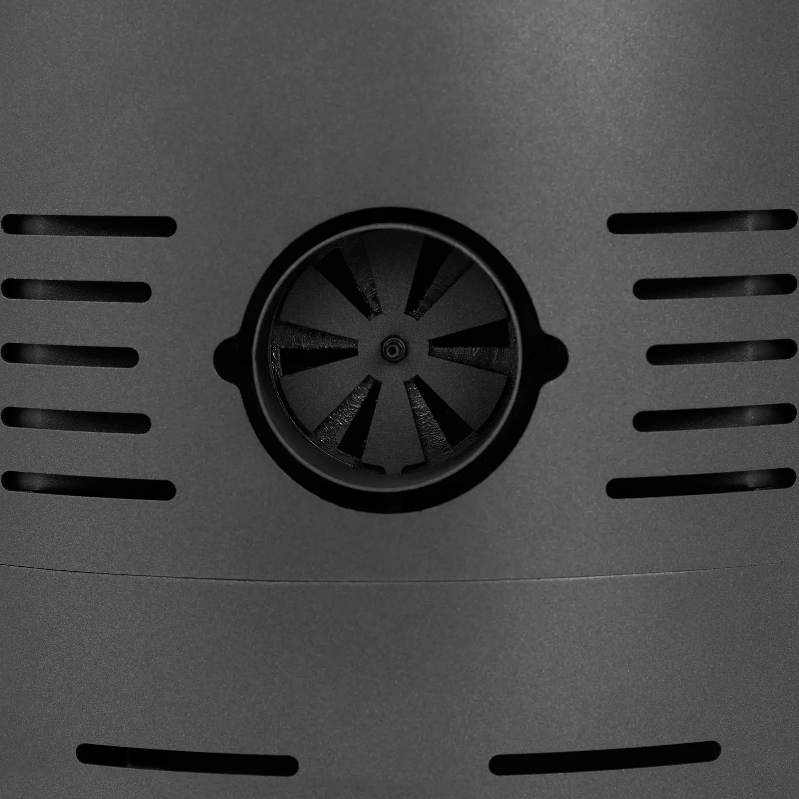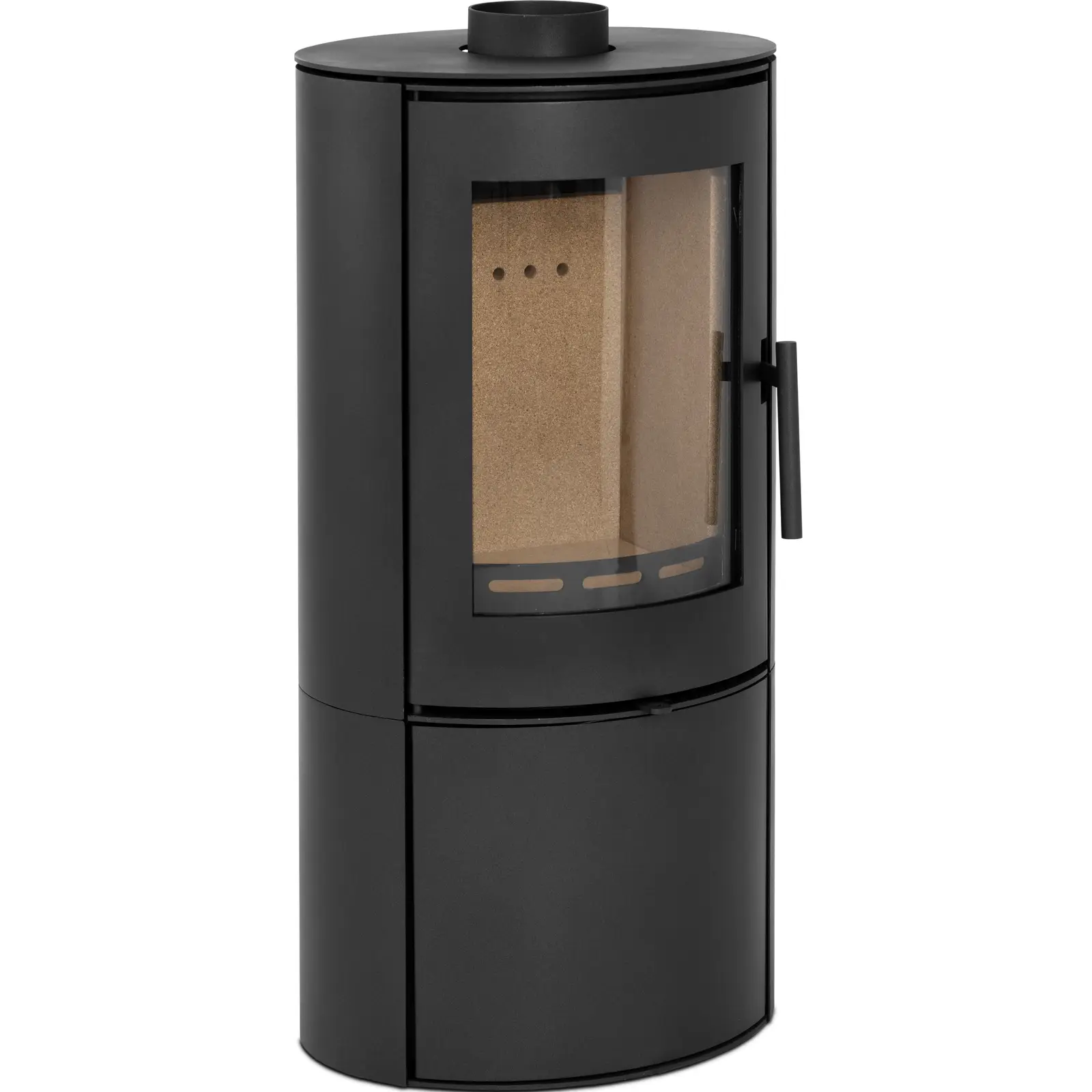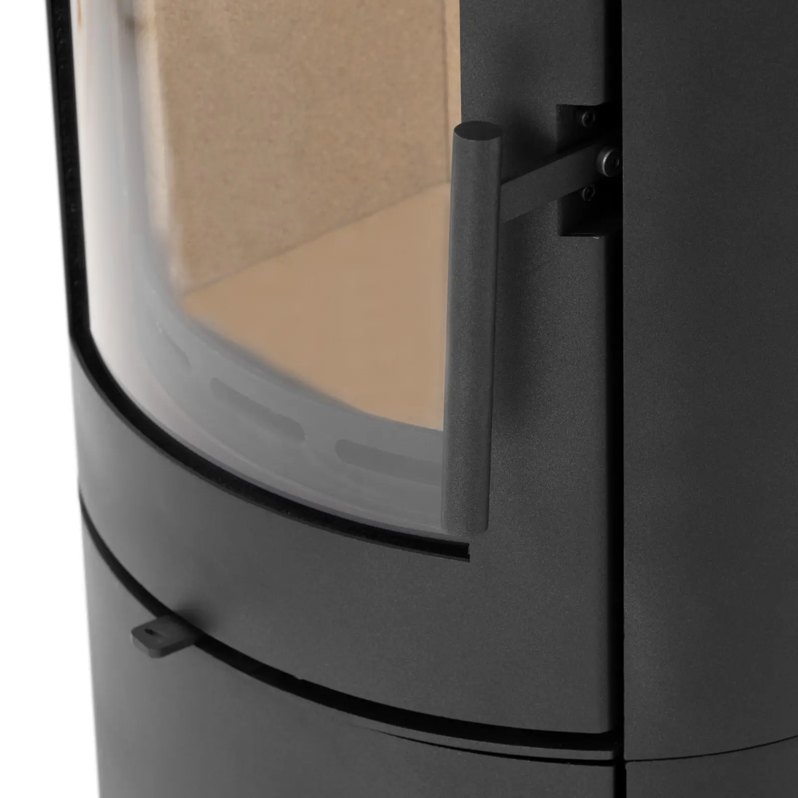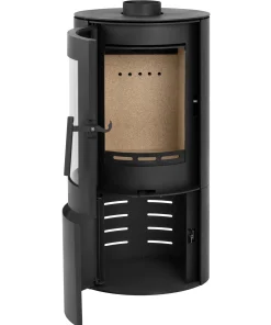 Kominek wolnostojący z cylindrycznym korpusem wykonanym ze stali i żeliwnym paleniskiem pozwala na relaksujący widok płomieni dzięki dużej szybie. Aby zapewnić jeszcze lepszy wgląd na ogień i większy komfort podczas rozpalania, komora jest nieco podniesiona nad półką na drewno opałowe. Piec jest wyposażony w ciśnieniowy mechanizm otwierania drzwi i otwory wentylacyjne chroniące przed wilgocią i pleśnią na drewnie.